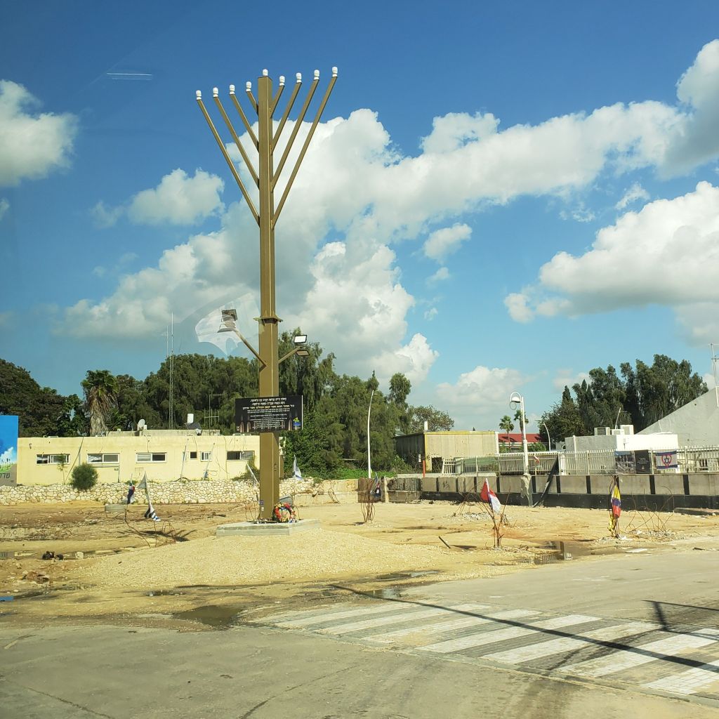 Sderot which is Hebrew for boulevard, is a small but pretty city sitting off of Highway 34 a third of the way between Ashkelon and Beer Sheva. It was named by Israel’s first prime minister David ben Gurion for the Eucalyptus trees that line its main avenue. The major employer in Sderot is the Osem plant according to Wiki. Osem is a food processing plant that produces items such as Bamba, Bisli instant noodles and rice dishes. The Menorah candle factory which produces Hanukkah candles that are shipped all over the world is also located here. Besides its industries, Sderot, despite it’s s proximity to Gaza and the constant barrage of rockets, is a growing town with a young community. Many musicians and poets have come from Sderot and boast that they practiced their music in bomb shelters! Many of the traffic circles are decorated with poetical and musical themes.